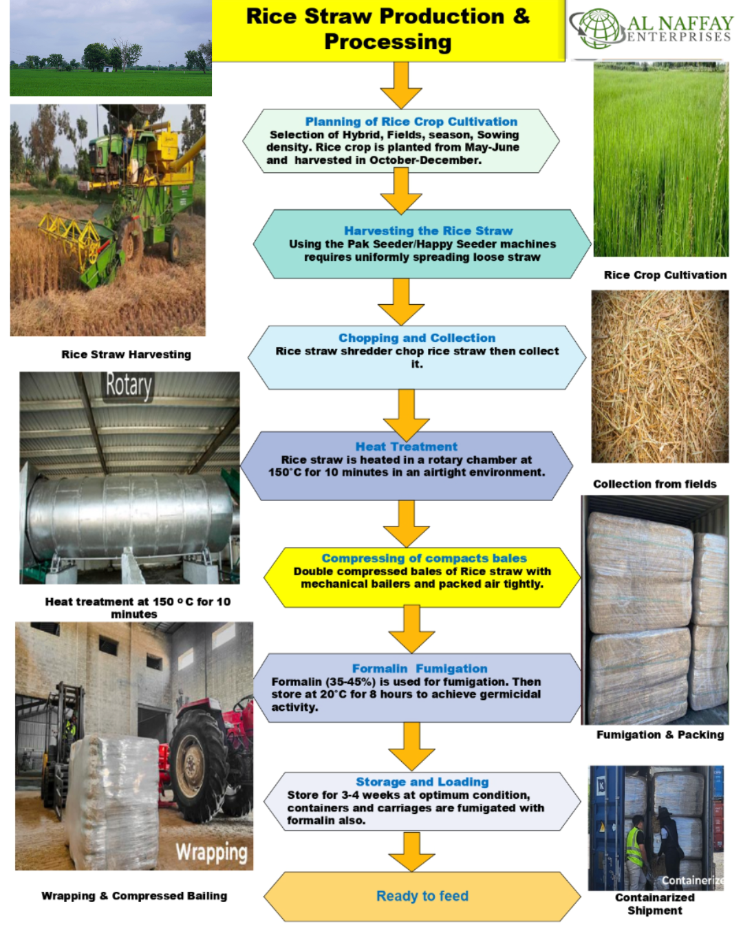 AL-NAFFAY Enterprises is one of the biggest animal feed exporter of Pakistan. We provide a high-quality rice straw, supplying fiber needs of farm animals. Our rice straw passes certain quality control processes to guarantee constant nutrient contents and suitability for feed. Our passion towards quality assurances provide valuable source of fiber for animal health and environment sustainability.